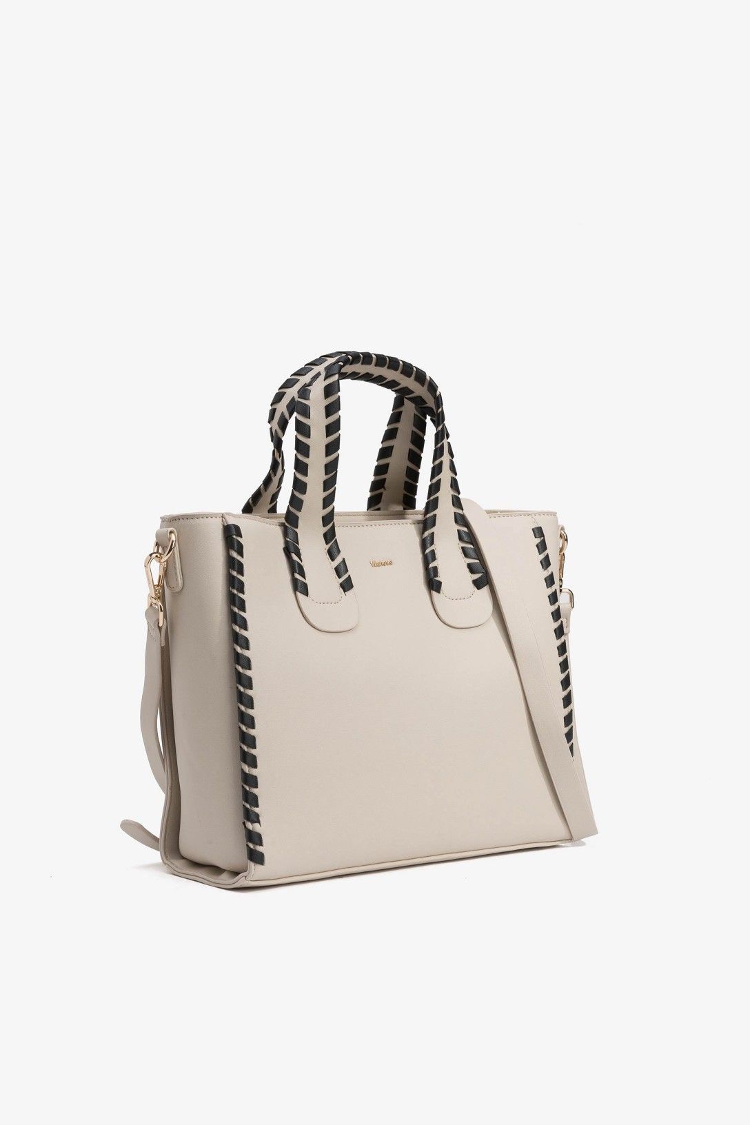 Bolso City de suave efecto piel, con contraste de color y pespuntes decorativos en alto relieve. Asas de mano fijas y bandolera ajustable y extraíble. Bolsillo interior con cremallera. Tamaño Mediano. Dimensiones: 30 x 24 x 11 cm