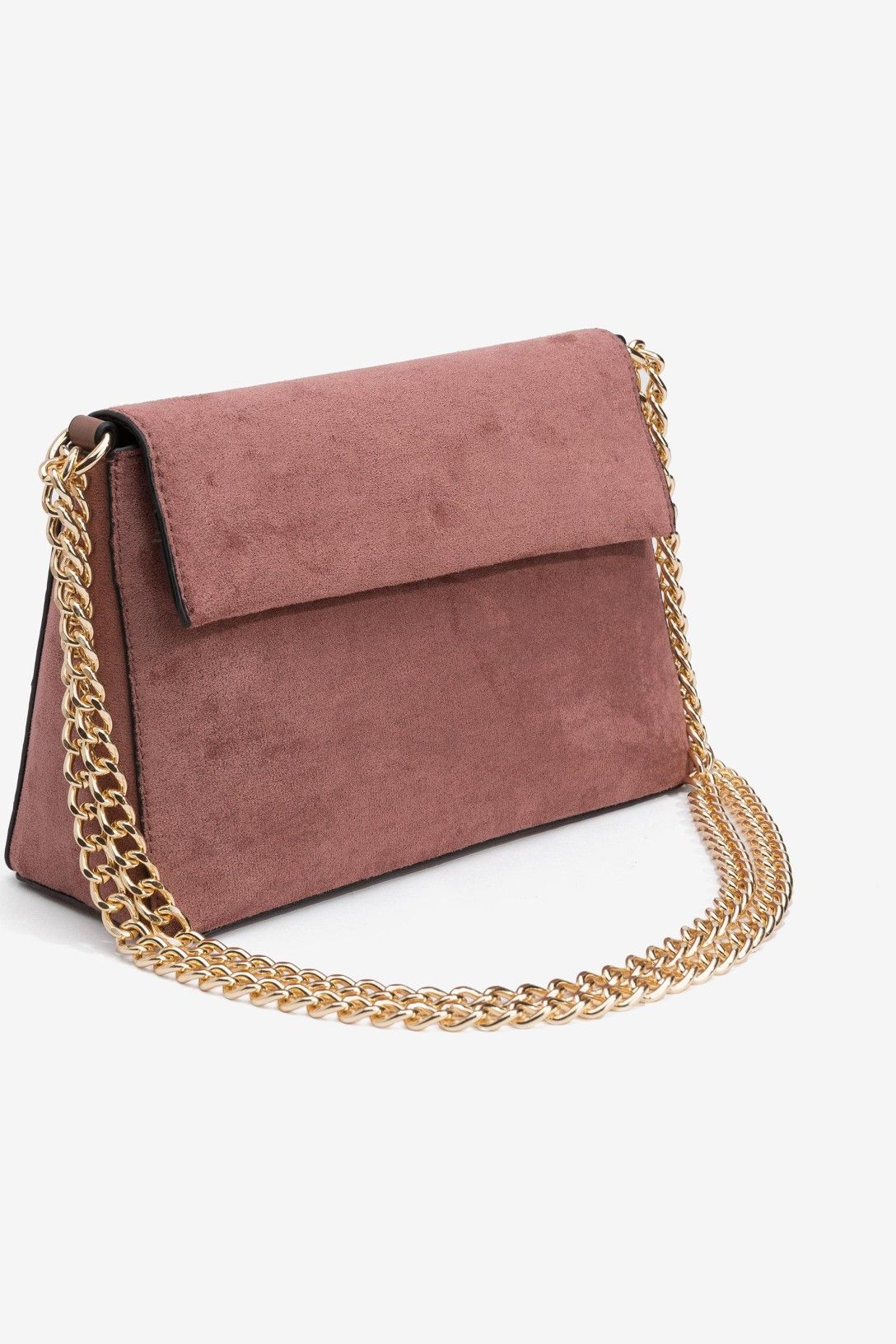 Bolso Bandolera Efecto Ante con asa de cadena y apertura de solapa con botón. Cierre interior con cremallera. Dimensiones: 23 x 17 x 8 cm