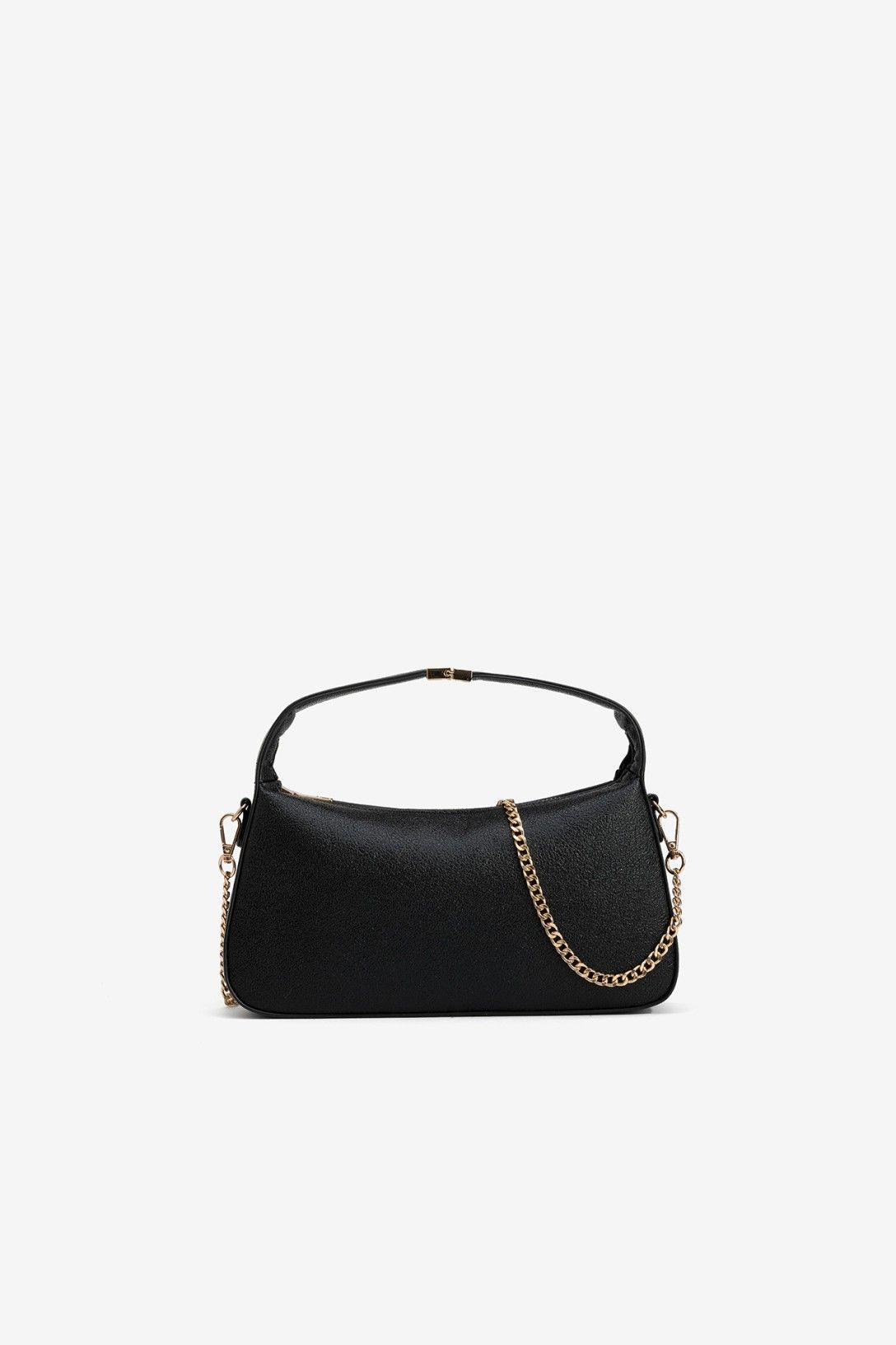 Elegante bolso negro con cadena dorada y cierre de cremallera, perfecto para eventos nocturnos.