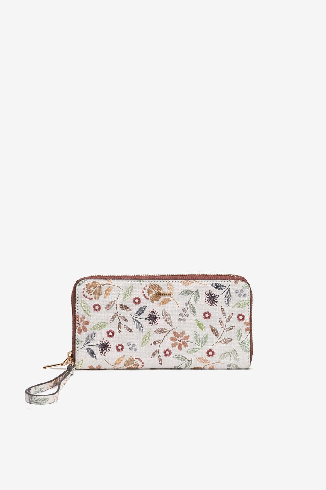 Monedero en efecto piel estampado, con cierre superior de cremallera y correa de mano extraíble. Compartimentos interiores para billetes, tarjetas y monedas. Tamaño grande. Dimensiones: 20 x 10 x 2,5 cm